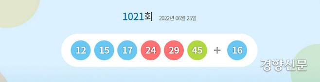 로또복권 운영사 동행복권은 제1021회 로또복권 추첨에서 ‘12·15·17·24·29·45’가 1등 당첨번호로 뽑혔다고 25일 밝혔다. 2등 보너스 번호는 ‘16’이다.