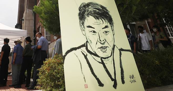 [서울=뉴시스] 조수정 기자 = 25일 오후 서울 종로구 천도교 대교당에서 열린 김지하 시인 추모문화제에서 한국화가 김봉준 화백이 그린 김지하 시인이 참석자들을 맞이하고 있다. 2022.06.25. chocrystal@newsis.com