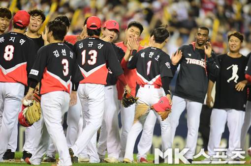 KIA 선수들이 승리 후 기뻐하고 있다.