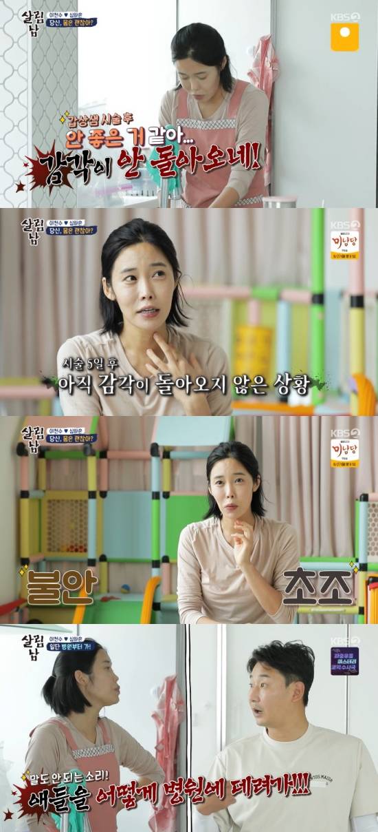 25일 방송된 KBS 2TV '살림하는 남자들 시즌2'에서는 심하은이 갑상샘 시술 후유증으로 인해 걱정하는 장면이 전파를 탔다.