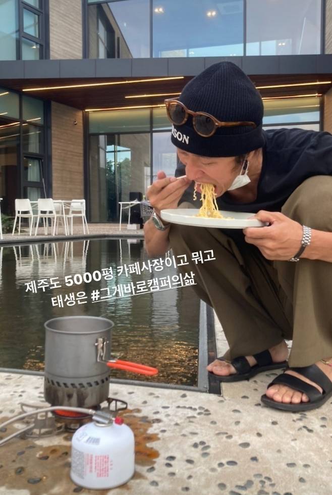 카페 외부 공간에 쭈그려 앉아 라면을 끓여먹고 있는 그는 "제주도 5,000평 카페 사장이고 뭐고 태생은 #그게 바로 캠퍼의 삶"이라고 밝혀 웃음을 자아낸다.