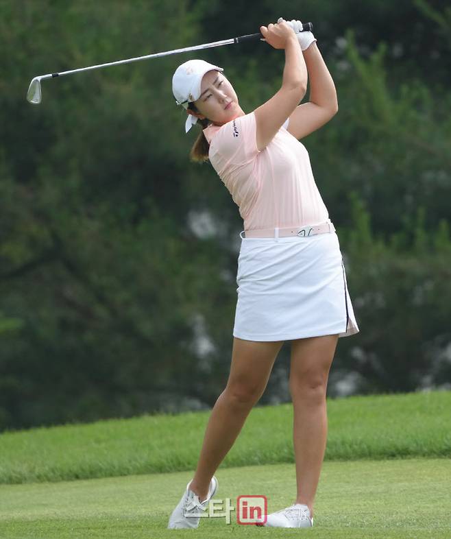 [이데일리 골프in=포천 조원범 기자]25일 경기도 포천에 위치한 포천힐스 컨트리클럽(파72. 6610 야드)에서 KLPGA투어 '비씨카드-한경 레이디스컵 2022(총상금 8억 원,우승상금 1억 4천4백만원)2라운드가 열렸다.조윤정의 17번홀 경기 장면.