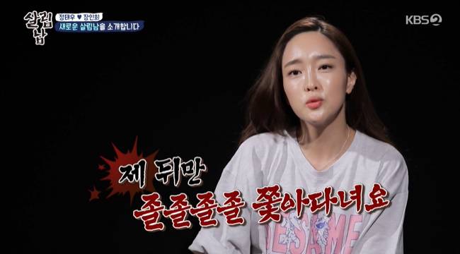장인희는 남편 정태우에 대해 "평소에 제 뒤만 졸졸 쫓아 다닌다. 저는 나갔으면 좋겠다"라며 "저는 좀 부담스럽고 힘이 들다"라고 거침없는 애정 표현에 힘들어 했다.