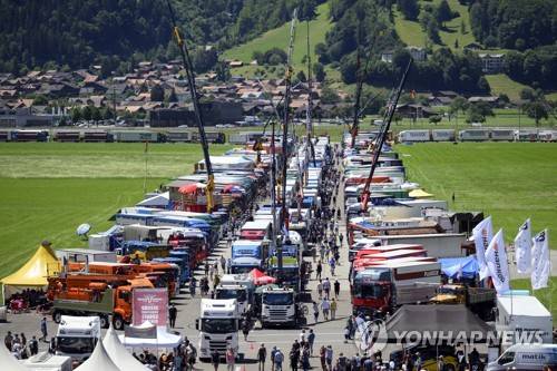 epa10033434 Trucks are pictured from a lifting crane, during the 27th Trucker and Country Festival, at Interlaken, Switzerland, 25 June 2022. The 27th edition of the festival is held from 24 to 26 June 2022 and features a truck mile, motorbikes, modern cowboys and aims to create a Western-style atmosphere. EPA/ANTHONY ANEX