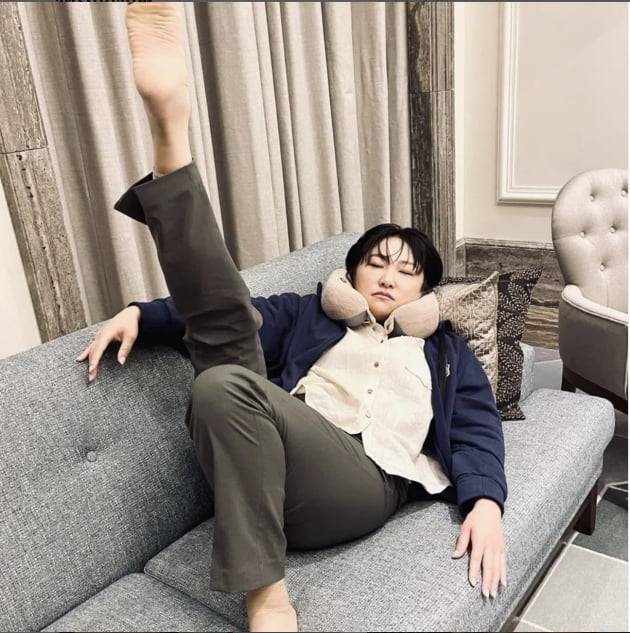 공개된 사진에는 촬영장 대기실의 소파에 누워 한쪽 다리를 번쩍 든 포즈를 취한 김현숙의 모습이 담겼다.