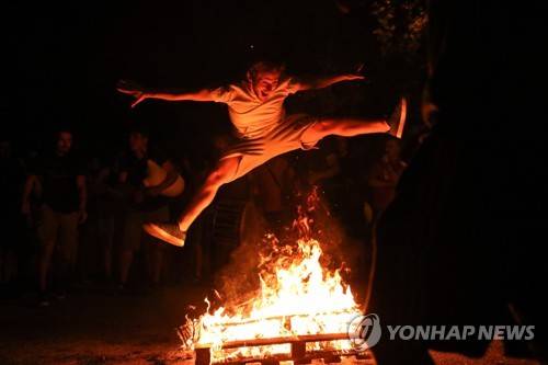 epaselect epa10033331 A reveller jumps over a bonfire lit on the occasion of the Klidonas ceremony at Kaisariani in Athens, Greece, 24 June 2022 night (issued 25 June 2022). During the traditional custom of Klidonas, that is celebrated in the night of Saint John Day (Agios Ioannis), people dance around and jump over a bonfire in ceremony related to fortune-telling and luck as - according to the ancient folk tradition - the custom of Klidonas reveals to the unmarried girls the identity of their future husband. EPA/GEORGE VITSARAS