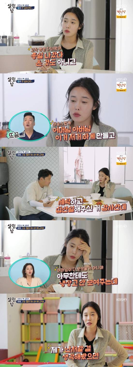 결국 심하은은 "그래도 이건 아니다. 내가 하루 종일 나갔다 오는 것도 아니고 병원 잠깐 갔다 오는 건데 어머님 아버님 고새 불러서 이거 하게 만들고 저거 하게 만들고"라며 불만을 토로했다.