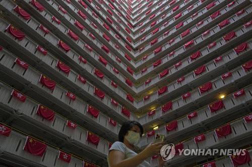 A woman walks past the Chinese and Hong Kong flags hanging from a residential building to celebrate the 25th anniversary of Hong Kong handover to China, at a public housing estate, in Hong Kong, Saturday, June 25, 2022. President Xi Jinping will participate in next week's celebrations of the 25th anniversary of the return of Hong Kong to China, the government said Saturday, but it left unclear whether he will visit the former British colony for the highly symbolic event after a crackdown on a pro-democracy movement. (AP Photo/Kin Cheung)