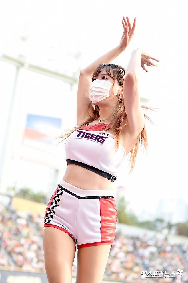 (엑스포츠뉴스 잠실, 김한준 기자) 25일 오후 서울 송파구 잠실야구장에서 열린 '2022 신한은행 SOL KBO리그' KIA 타이거즈와 두산 베어스의 경기, KIA 치어리더 김한나가 멋진 공연을 선보이고 있다.