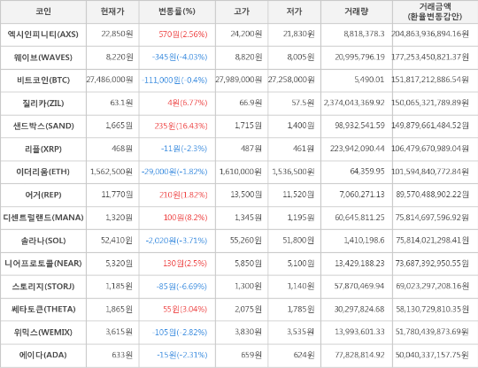 또한, 디센트럴랜드(8.2%, 1,320원), 질리카(6.77%, 63.1원), 쎄타토큰(3.04%, 1,865원), 엑시인피니티(2.56%, 22,850원), 니어프로토콜(2.5%, 5,320원), 어거(1.82%, 11,770원)가 상승세를 나타냈다.