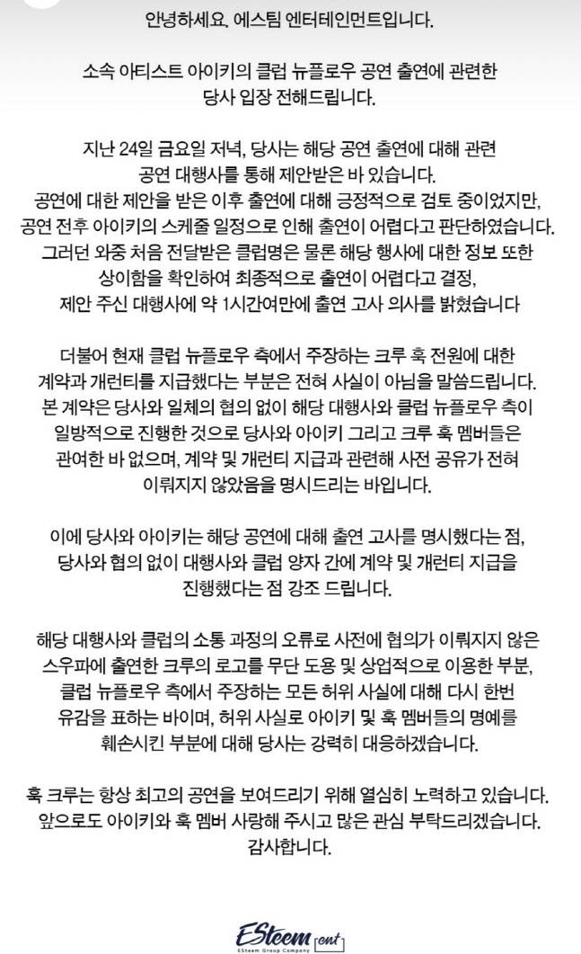 아이키의 소속사 에스팀엔터테인먼트 측은 26일 오전 공식 SNS에 아이키와 아이키가 이끄는 댄스크루 훅(HOOK)의 클럽 뉴플로우 공연 취소 논란과 관련해 입장을 밝혔다.