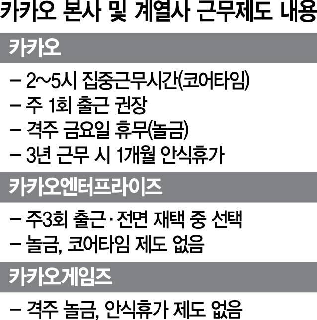 카카오엔터프라이즈의 경우 "본사보다 낫다"는 평가가 잇따르는 반면, 일부 계열사 직원들은 본사 근무제도를 부러워하는 상반된 장면이 연출되고 있다.