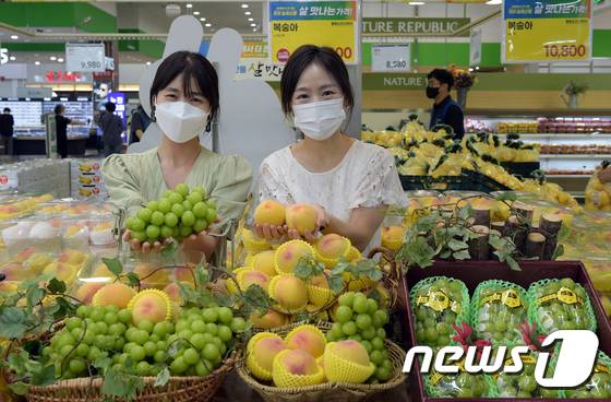 (서울=뉴스1) = 26일 서울 서초구 하나로마트 양재점에서 모델들이 여름 과일인 샤인머스캣과 그린황도를 선보이고 있다. 샤인머스캣은 평균 16브릭스(Brix)가 넘는 높은 당도와 함께 아삭한 식감과 낮은 산도로 인기가 높은 여름 과일이다. 그린황도는 평균 13브릭스로 복숭아 중에서도 당도가 높은 편이며 6월 말부터 7월 중순까지만 맛볼 수 있다. (농협유통 제공) 2022.6.26/뉴스1