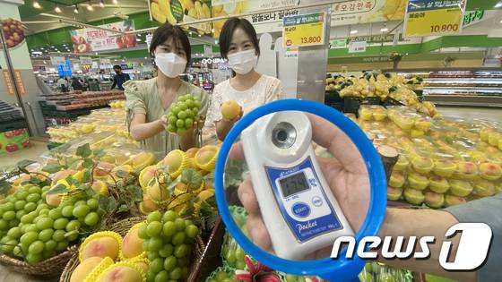 (서울=뉴스1) = 26일 서울 서초구 하나로마트 양재점에서 모델들이 여름 과일인 샤인머스캣과 그린황도를 선보이고 있다. 샤인머스캣은 평균 16브릭스(Brix)가 넘는 높은 당도와 함께 아삭한 식감과 낮은 산도로 인기가 높은 여름 과일이다. 그린황도는 평균 13브릭스로 복숭아 중에서도 당도가 높은 편이며 6월 말부터 7월 중순까지만 맛볼 수 있다. (농협유통 제공) 2022.6.26/뉴스1