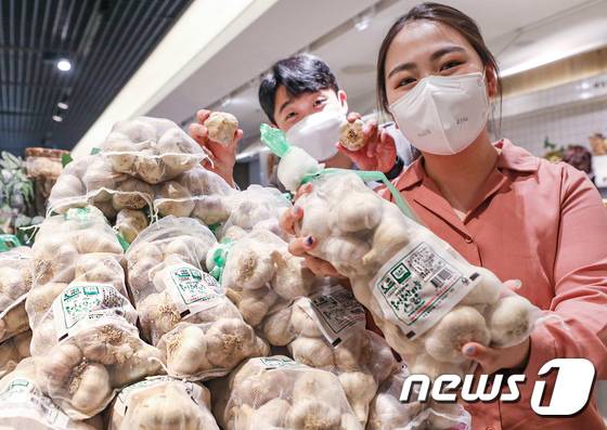 (서울=뉴스1) = 26일 서울 강남구 현대백화점 무역센터점에서 직원들이 홍산마늘을 소개하고 있다. 현대백화점은 압구정본점 등 경인지역 11개 점포와 충북 청주시 충청점 식품관에서 내달 3일까지 농촌진흥청에서 개발한 국산 신품종인 '홍산마늘'을 선보인다고 밝혔다. 홍산마늘은 일반 마늘보다 알이 단단하고 당도가 높은 것이 특징이다. (현대백화점 제공) 2022.6.26/뉴스1