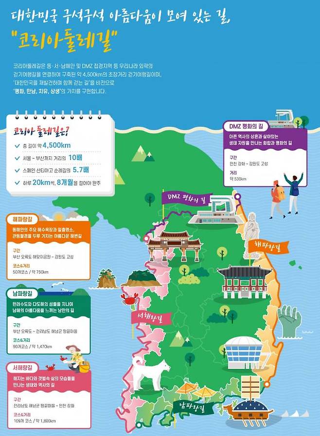 한편 코리아둘레길은 동‧서‧남해안과 DMZ 접경지역 등 우리나라 외곽의 걷기 여행길을 연결한 총길이 약 4500㎞의 초장거리 걷기 여행 코스다.