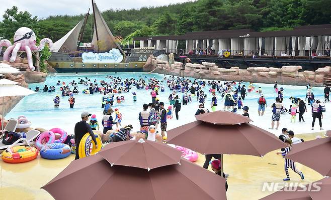 [대구=뉴시스] 이무열 기자 = 워터파크가 야외개장을 통해 본격적인 여름 시즌에 돌입한 가운데 26일 오전 대구 달성군 가창면 스파밸리를 찾은 시민들이 야외 수영장 파도 풀에서 물놀이를 하며 더위를 식히고 있다. 2022.06.26. lmy@newsis.com