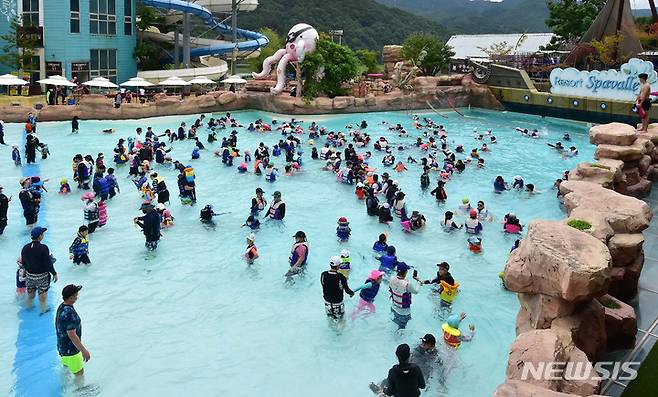 [대구=뉴시스] 이무열 기자 = 워터파크가 야외개장을 통해 본격적인 여름 시즌에 돌입한 가운데 26일 오전 대구 달성군 가창면 스파밸리를 찾은 시민들이 야외 수영장 파도 풀에서 물놀이를 하며 더위를 식히고 있다. 2022.06.26. lmy@newsis.com