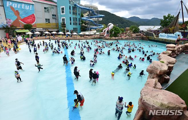 [대구=뉴시스] 이무열 기자 = 워터파크가 야외개장을 통해 본격적인 여름 시즌에 돌입한 가운데 26일 오전 대구 달성군 가창면 스파밸리를 찾은 시민들이 야외 수영장 파도 풀에서 물놀이를 하며 더위를 식히고 있다. 2022.06.26. lmy@newsis.com