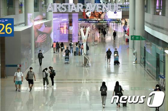 (인천공항=뉴스1) 구윤성 기자 = 26일 인천국제공항 제1여객터미널 내 면세구역에서 여행객들이 항공기 탑승 대기실로 이동하고 있다. 2022.6.26/뉴스1