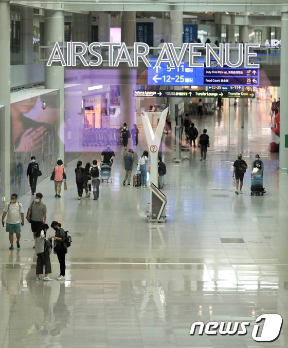 (인천공항=뉴스1) 구윤성 기자 = 26일 인천국제공항 제1여객터미널 내 면세구역에서 여행객들이 항공기 탑승 대기실로 이동하고 있다. 2022.6.26/뉴스1