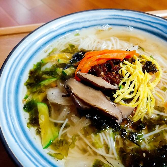 계란지단과 볶은 호박과 버섯, 그리고 가늘고 예쁘게 썬 오이 채에 화룡점정으로 구운 김가루까지 고명으로 올린 그야말로 잔치에 걸맞은 '고급진' 잔치국수와는 달리, 엄마의 잔치국수는 사실 없던 식욕을 불러올 만큼 그다지 볼품이 있는 것은 아니었다.