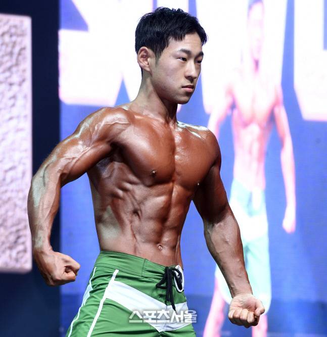 26일 경기도 화성시 장안대학교에서 열린 '2022 WNGP 수원'에서 피지크 부문에 출전한 문세환이 탄탄한 근육을 뽐내고 있다.