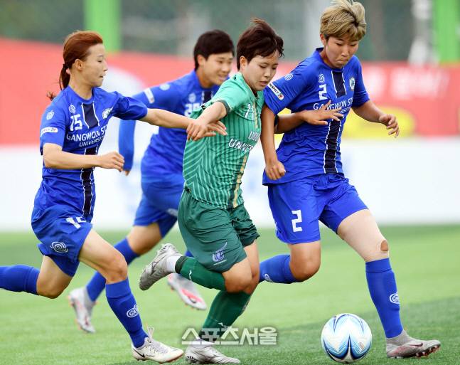 경북 위덕대 전민지(가운데)가 26일 삼척복합체육공원에서 열린 제30회 여왕기 전국여자축구대회 강원도립대와 경기에서 드리블을 하고 있다.