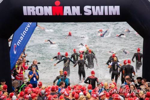 epaselect epa10034504 Athletes compete at the start of the Swimming portion of the Ironman European Championship at Forest Lake Langen near Frankfurt am Main, Germany, 26 June 2022. EPA/CONSTANTN ZINN
