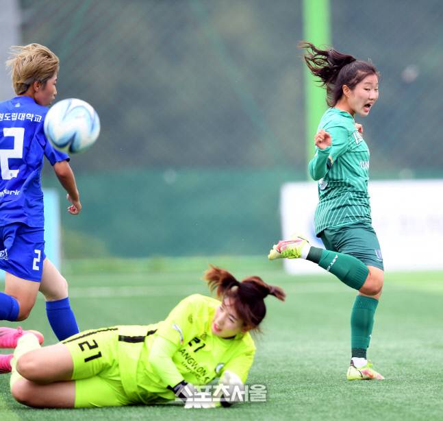 경북 위덕대 백진주가 26일 삼척복합체육공원에서 열린 제30회 여왕기 전국여자축구대회 강원도립대와 경기에서 상대 골키퍼에 볼을 뺏긴 후 아쉬워하고 있다.