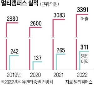 증권가에서는 멀티캠퍼스가 올해 역대 최대 실적을 경신할 것으로 내다봤다. 유안타증권은 올해 멀티캠퍼스가 매출 3391억원, 영업이익 311억원으로 각각 전년 대비 10%, 17.6% 개선된 실적을 낼 것으로 전망했다. 지난해에 이어 2년 연속 두 자릿수 성장률이 가능할 것이란 예측이다.