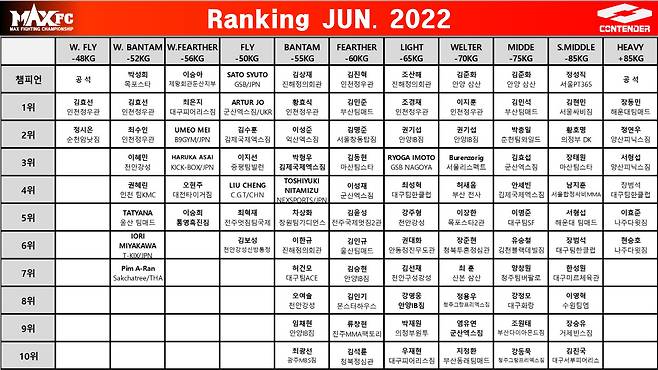 국내 최대 입식격투기 단체 MAX FC가 2022년 6월 랭킹을 발표했다.