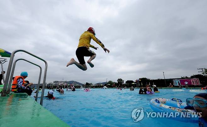(서울=연합뉴스) 류영석 기자 = 주말인 26일 오후 최근 개장한 서울 잠원한강공원 수영장에서 한 어린이가 다이빙을 하고 있다. 2022.6.26