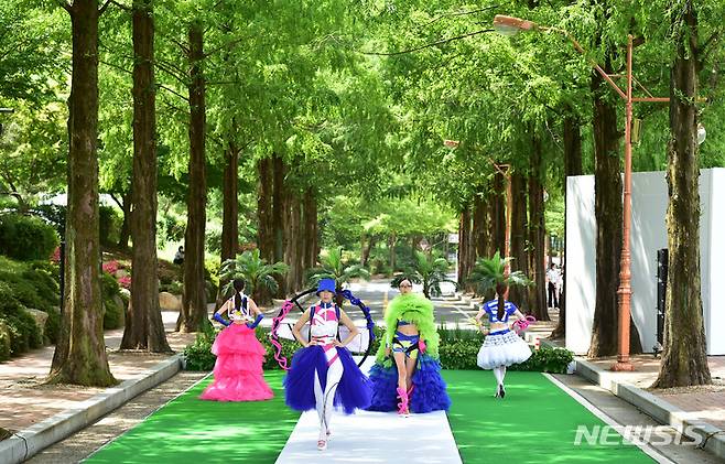 [대구=뉴시스] 이무열 기자 = 26일 오후 대구 달서구 계명대학교 성서캠퍼스 메타세쿼이아길에서 재생(play back)을 주제로 한 미술대학 패션디자인학과 제24회 졸업작품 패션쇼 리허설을 하고 있다. 2022.06.26. lmy@newsis.com