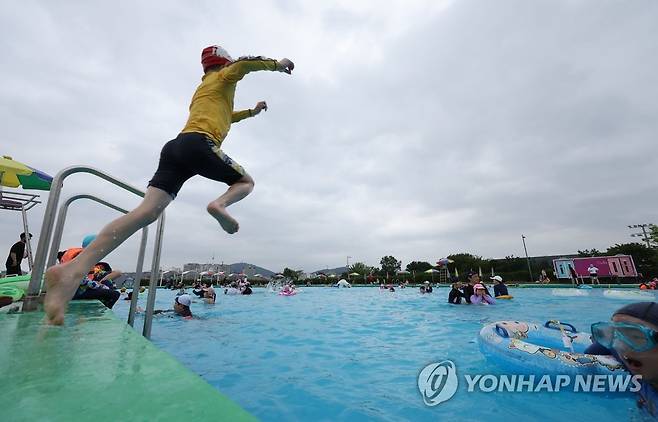 (서울=연합뉴스) 류영석 기자 = 주말인 26일 오후 최근 개장한 서울 잠원한강공원 수영장에서 한 어린이가 다이빙을 하고 있다. 2022.6.26