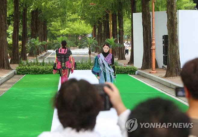 (대구=연합뉴스) 박세진 기자 = 26일 대구 달서구 계명대학교 성서캠퍼스 메타세쿼이아길에서 패션디자인 전공 학생들이 졸업패션쇼 리허설을 하고 있다. 이어서 진행된 대면 졸업패션쇼는 코로나19로 인해 3년 만에 열렸다. 2022.6.26
