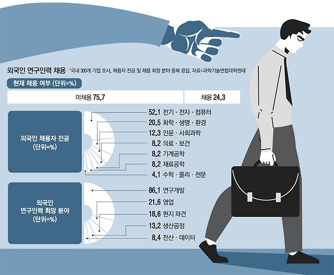 한국산업기술진흥협회(KOITA)와 과학기술연합대학원대학교(UST)가 국내 300개 기업을 대상으로 조사한 결과 외국인 연구인력을 채용한 곳은 24%인 73곳에 불과했다. 기업당 평균 외국인 채용 인력은 단 2명으로, 그나마 이 중 1.1명은 학사 학위 소지자였고 단 0.3명만이 박사였다. 국내 기업들이 고학력 외국 전문인력을 쉽게 뽑지 못하는 형국이다. 기업들은 '국내 외국인 유학생에 대한 정보 부족'(43%) '한국어 의사소통 어려움'(15%) 등을 주요 원인으로 꼽았다.