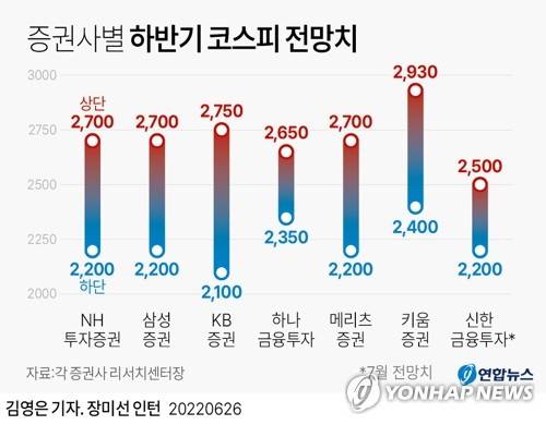 (서울=연합뉴스) 김영은 기자 = 26일 연합뉴스가 NH투자·삼성·KB·하나금융·메리츠·키움·다올투자 등 증권사들을 대상으로 올해 하반기 지수 전망을 긴급 설문한 결과, 이들 증권사는 코스피가 올해 하반기에도 약세를 이어갈 것으로 보고 전망치 하단을 2,100∼2,200으로 낮춰 제시했다.