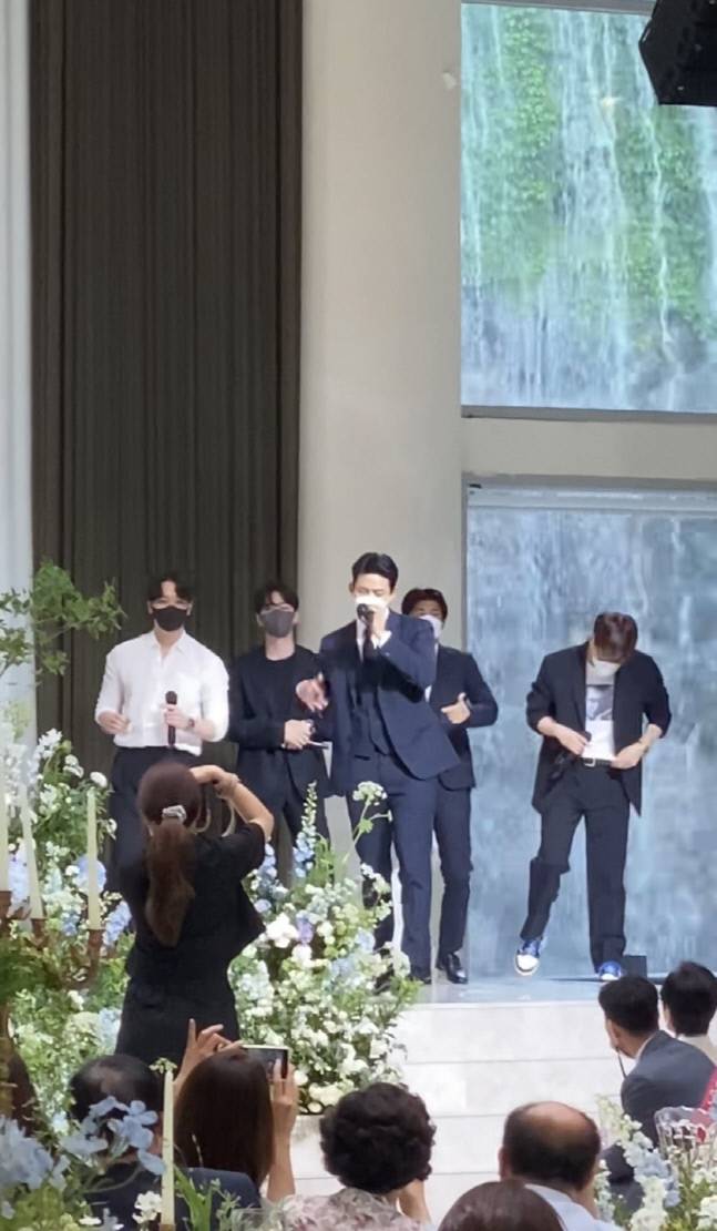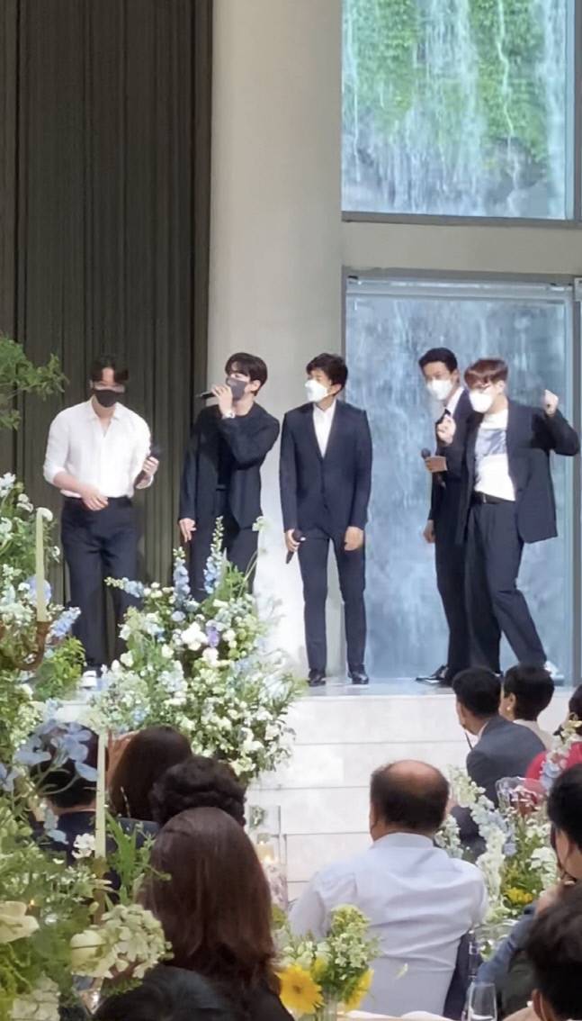 이날 결혼식에서 2PM 멤버 5명은 히트곡 ‘우리 집으로 가자’와 ‘10점 만점에 10점’을 부르며 예식장을 뜨겁게 달궜다. 멤버들은 노래와 함께 가벼운 안무까지 곁들여 흥겨운 분위기를 연출했다.