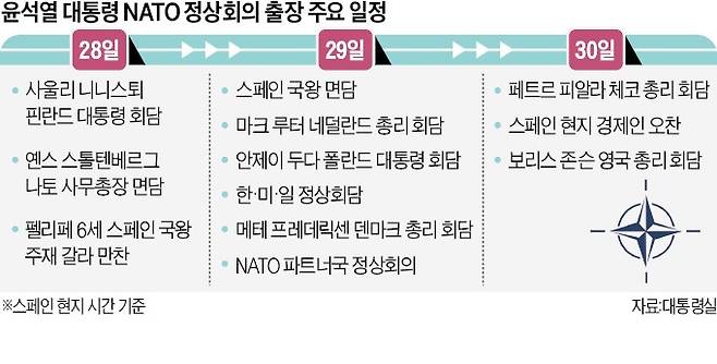 대통령실은 이번 NATO 정상회의를 계기로 스페인 현지에서 한·미·일 정상회의와 양자 정상회담 9건 등 총 14건의 정상급 외교 행사를 확정했다고 설명했다. 이들 행사는 △원자력과 방산 수출(체코 폴란드 네덜란드 영국) △반도체 협력(네덜란드) △전기차·배터리·인공지능 협력(캐나다) △신재생에너지(덴마크) 등 NATO 회원국과의 경제 협력에 중점을 두고 있는 것으로 알려졌다.