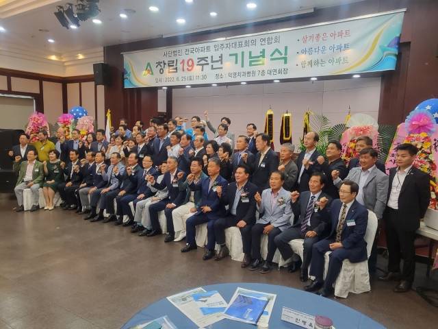 전국아파트입주자대표회의연합회(전아연·회장 김원일) 창립 19주년 기념식의 참석자들이 25일 대구 중구 덕영치과병원 7층 연회장에서 살기 좋은 아파트를 위해 파이팅을 외치고 있다.