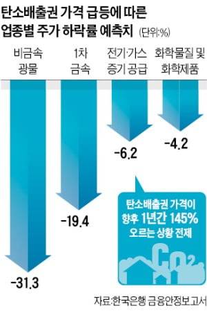 한은 관계자는 "탄소배출권 가격 흐름을 전망하기가 쉽지 않아 작년 유럽의 가격 상승률을 단순 적용해 계산했다"며 "불어난 탄소배출권 매입 비용을 고려해 기업의 부가가치 감소 폭과 주가 흐름을 산출했다"고 말했다.