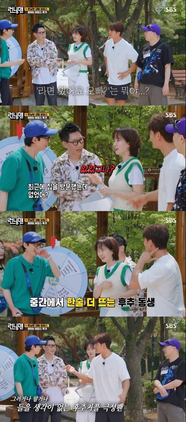 송지효가 "집에 라면 있나"라고 묻자 김종국은 "사야지"라고 답했다. 이를 들은 유재석과 지석진은 "라면 있어요 오빠는 뭐야. 최근에 종국이 집에 갔는데 라면이 없었구나?"라고 몰아갔다.