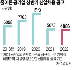 26일 한국경제신문이 공공기관 경영정보 공개시스템 ‘알리오’에 올라온 36개 공기업 전체의 채용공고를 분석한 결과 올 상반기 신입직원 채용공고(정규직, 무기계약직, 비정규직, 체험형 청년인턴 등)가 난 인원은 총 4886명이었다. 작년 상반기(5073명)보다 3.7% 줄었고, 2020년 상반기(1만3명)에 비해선 반토막이 났다.