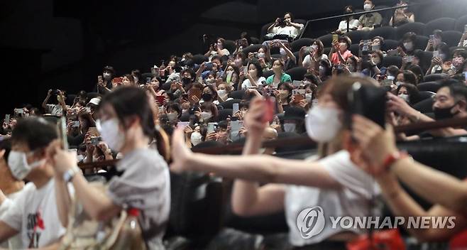 (도쿄=연합뉴스) 이세원 특파원 = 영화 '브로커' 일본 개봉 사흘째인 26일 오후 도쿄의 한 영화관에서 열린 무대 인사 행사에서 고레에다 히로카즈 감독과 송강호·강동원·이지은(아이유)·이주영이 포즈를 취하는 모습을 관람객이 스마트폰 등으로 촬영하고 있다. 2022.6.26