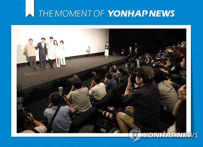 (도쿄=연합뉴스) 이세원 특파원 = 영화 '브로커' 일본 개봉 사흘째인 26일 오후 도쿄의 한 영화관에서 열린 무대 인사 행사에서 고레에다 히로카즈 감독과 송강호·강동원·이지은(아이유)·이주영이 포즈를 취하는 모습을 취재진이 촬영하고 있다. 2022.6.26 [THE MOMENT OF YONHAPNEWS]