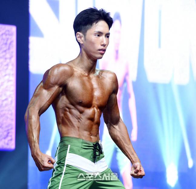 26일 경기도 화성시 장안대학교에서 열린 '2022 WNGP 수원'에서 피지크 노비스 부문에 출전한 이민수가 탄탄한 근육을 뽐내고 있다.