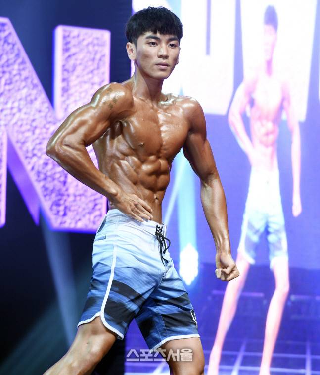 26일 경기도 화성시 장안대학교에서 열린 '2022 WNGP 수원'에서 피지크 노비스 부문에 출전한 김다훈이 탄탄한 근육을 뽐내고 있다.
