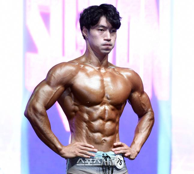 26일 경기도 화성시 장안대학교에서 열린 '2022 WNGP 수원'에서 피지크 노비스 부문에 출전한 최준혁이 탄탄한 근육을 뽐내고 있다.