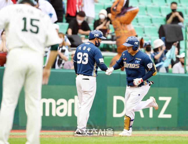 NC 권희동이 26일 인천 SSG랜더스필드에서 열린 2022 KBO리그 SSG와의 경기 4회초 무사 SSG 선발 이태양을 상대로 솔로 홈런을 치고 베이스를 돌면서 이종욱 코치와 하이파이브를 하고 있다. 권희동의 시즌 2호 홈런. 2022. 6. 26.